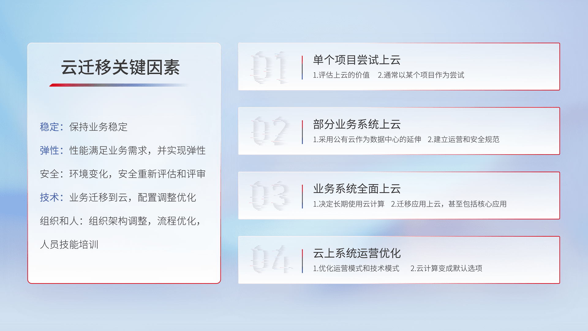 结合实际业务,,,从规划设计、、、、云平台选型、、云原生改造、、数据迁移、、集成交付,,迁移全过程为客户识别最佳上云路径,,,,做好风险识别管理,,,设计网络架构、、、身份权限、、安全审计合规、、、、操作审计、、、日志审计、、、、监控告警策略、、、、多站点容灾设计等,,对云上基础设施进行整体规划,,,提升IT治理水平,,,,以满足弹性、、、高可用、、、高性能的需求。。。