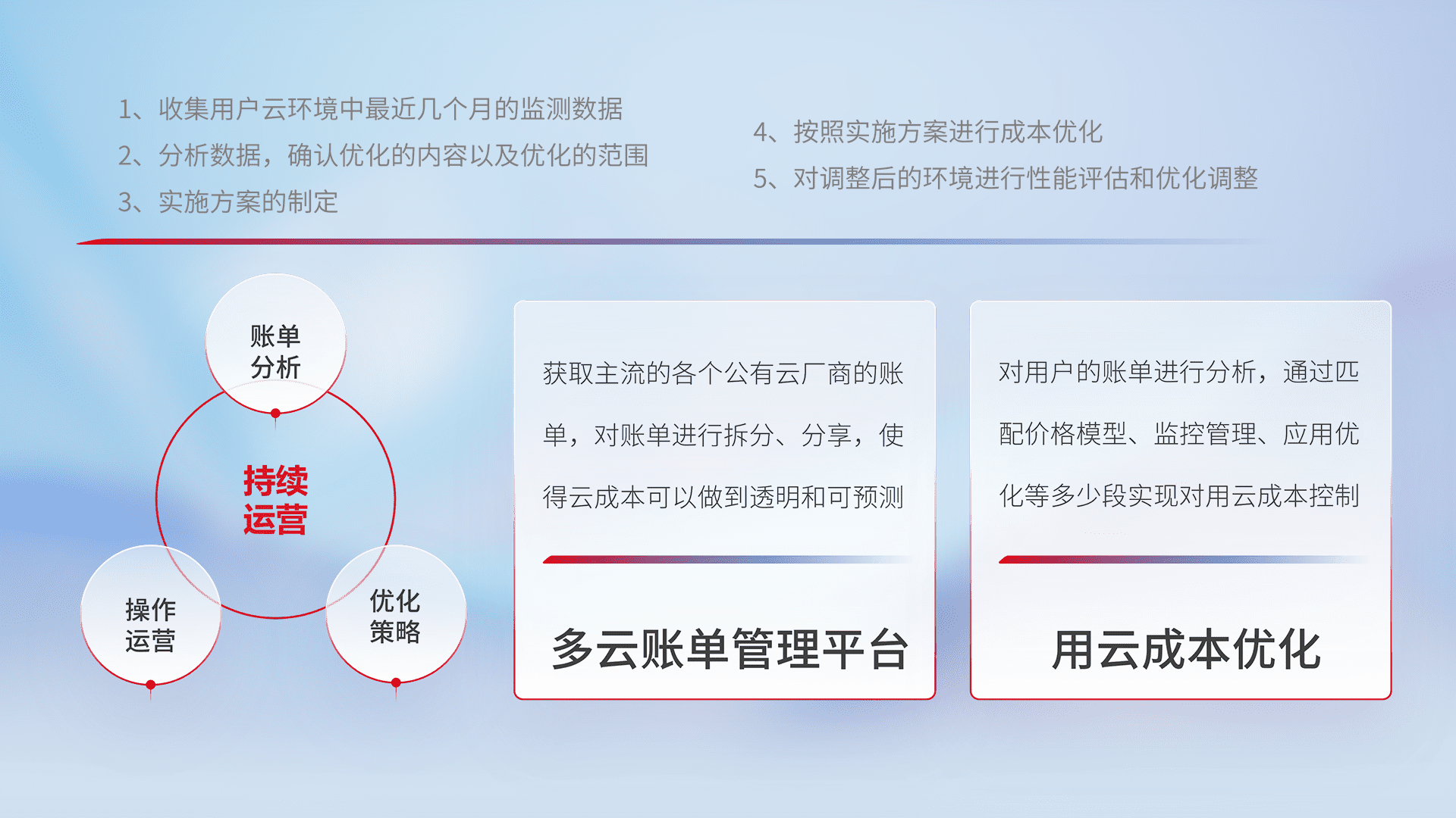 通过多云纳管,,,以统一的资源数据模型把客户的云资源进行抽象和封装,,,进而实现对多云资源的统一操作,,,保障云资源管理的可靠性、、稳定性与可用性。。量身定制化运维内容,,,,配置、、、、开发运维、、补丁管理、、、备份、、、、监控、、、认证和访问管理、、审计和日常巡检等,,,保障在用云过程中的可靠度,,稳定度以及高可用率。。。