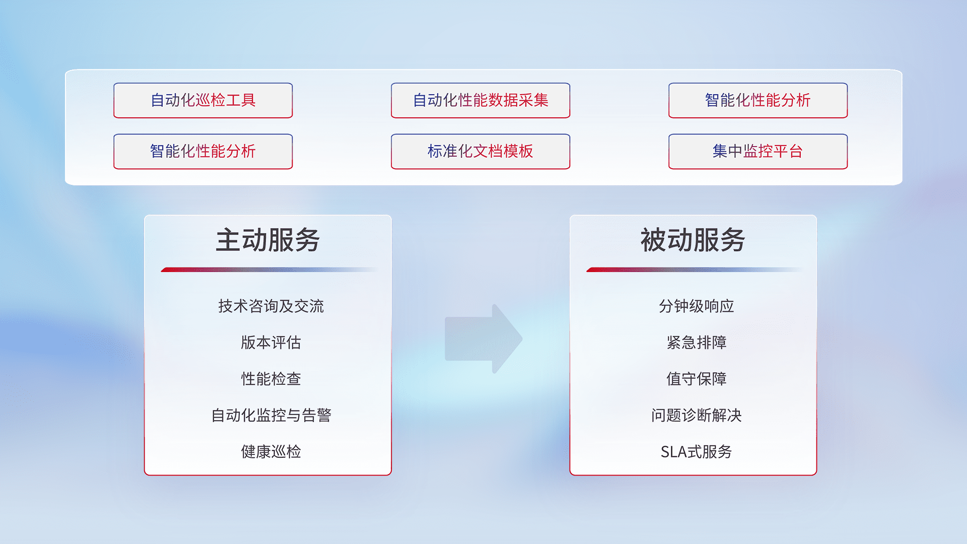 智能化工具和标准化文档,,,,保障服务质量,,,提供主动服务(包含技术咨询、、版本评估、、、、性能检查、、、、自动化监控与告警、、健康巡检)和被动服务包含(分钟级响应、、、紧急排障、、、、值守保障、、、问题诊断解决、、、、SLA服务)。。。